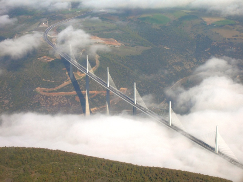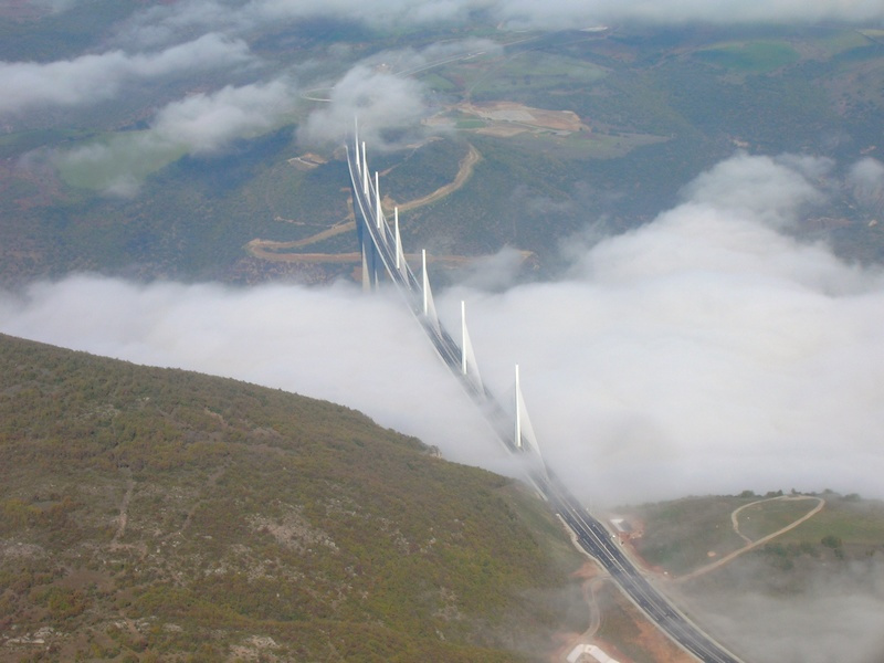 Entrée magistrale, à tours de roues mesurés, sur le tablier de l’immense viaduc de Millau. Grandiose, magnifique ; quelle réussite ! Mais il en coûte 7,30 €. C’est cher mais que de temps gagné car bien sûr l’autoroute continue après la ville, là où jadis se tortillait une route malaisée.