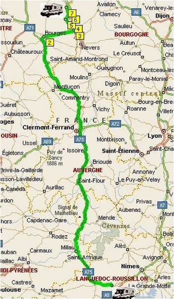 A Clermont, erreur fatale. Sans doute assoupi par la digestion et le ronronnement du moteur, je me trompe de route, je suis bêtement le grand ruban au lieu de bifurquer à droite vers Nevers. Danielle s’est justement endormie au moment crucial et n’a pas pu m’avertir. Ce n’est que longtemps après que je constate ma méprise et voilà Danielle le nez collé dans la carte pour m’indiquer la meilleure transversale afin de rejoindre notre itinéraire.