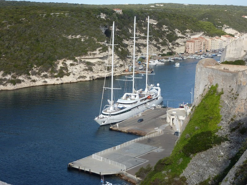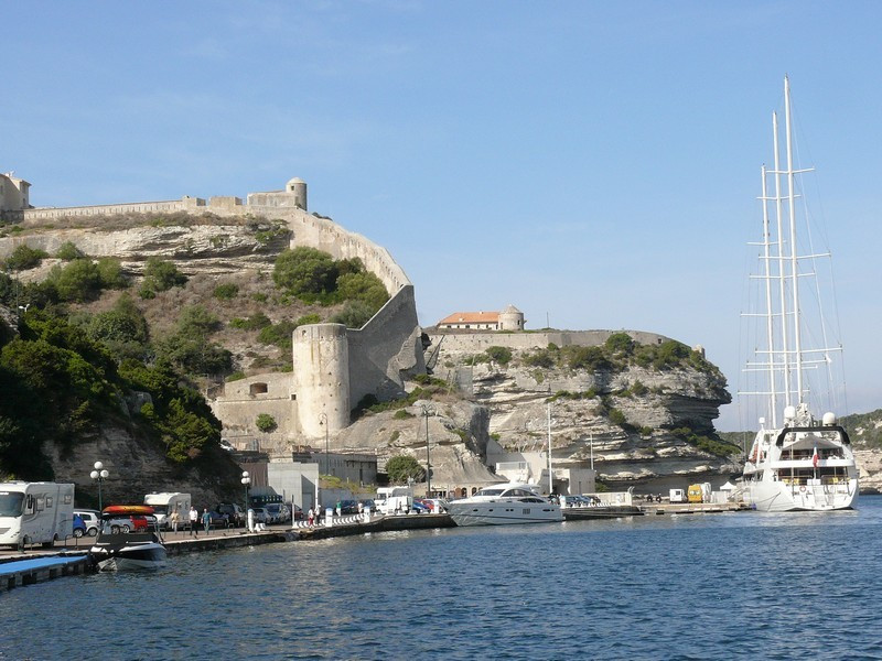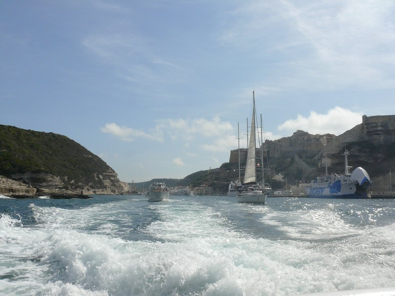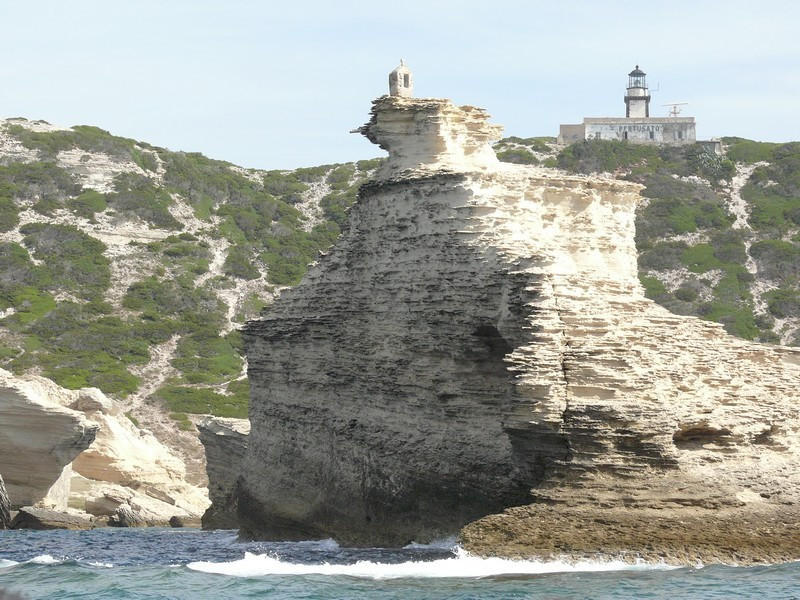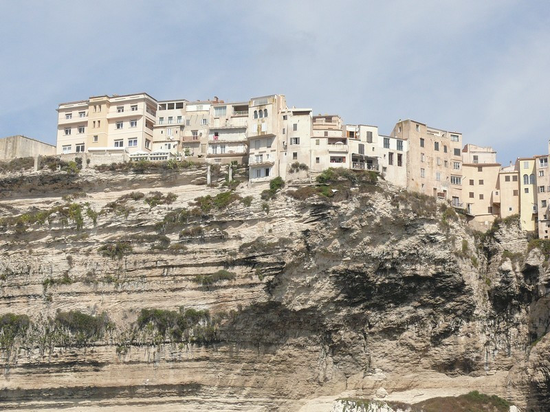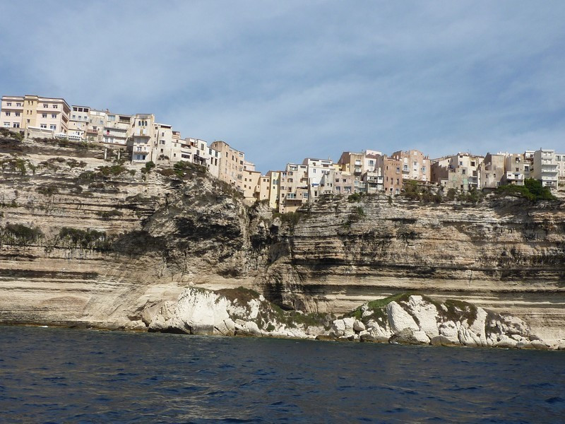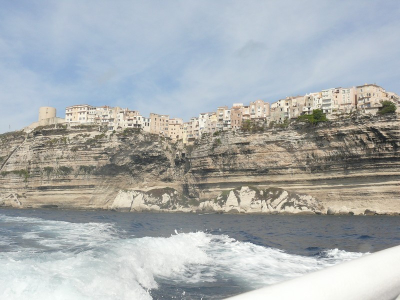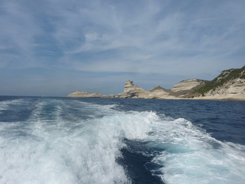 Puis nous repassons devant Bonifacio pour longer les hautes falaises de plus de 60 mètres de haut qui font face à la Sardaigne où à l’aplomb de celles-ci est édifiée la vieille ville avec le célèbre escalier du roi d’Aragon taillé à même la falaise qui conduit le promeneur disons sportif à la mer au bout de 187 marches.