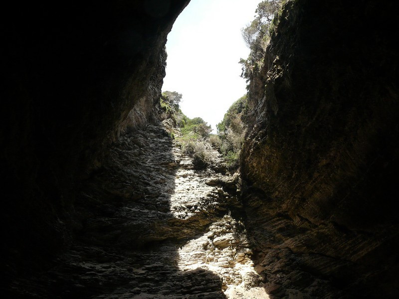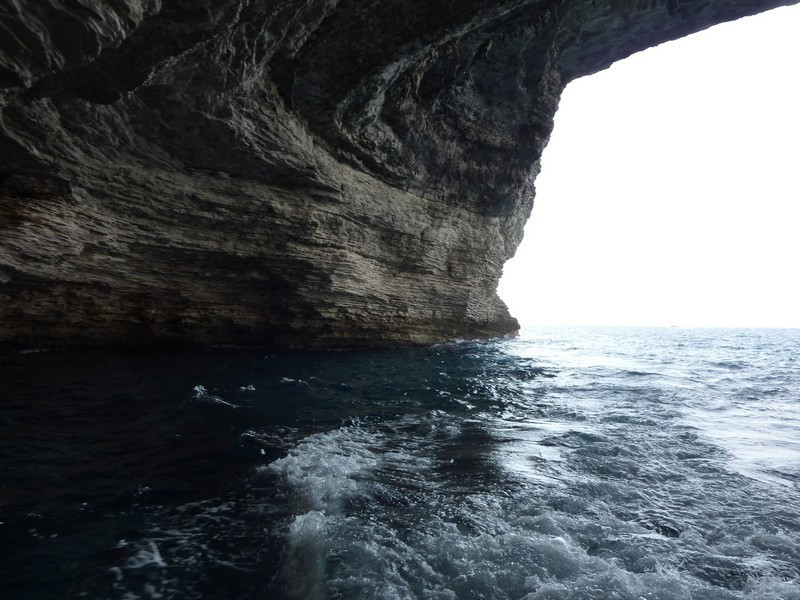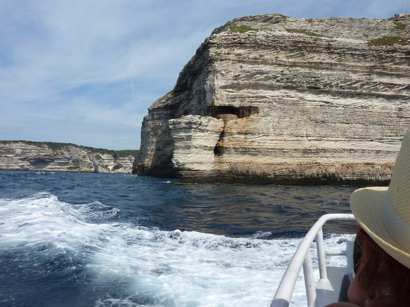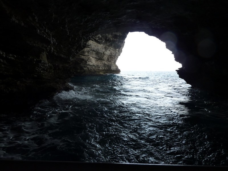 Embarquement, puis sortie du goulet, la mer est calme ce n’est pas plus mal, le bateau aborde les bouches de Bonifacio et pénètre dans la grotte marine du Sdragonato (du Dragon) où l’on peut voir, découpée dans l’azur, la forme renversée de la Corse.