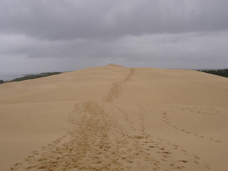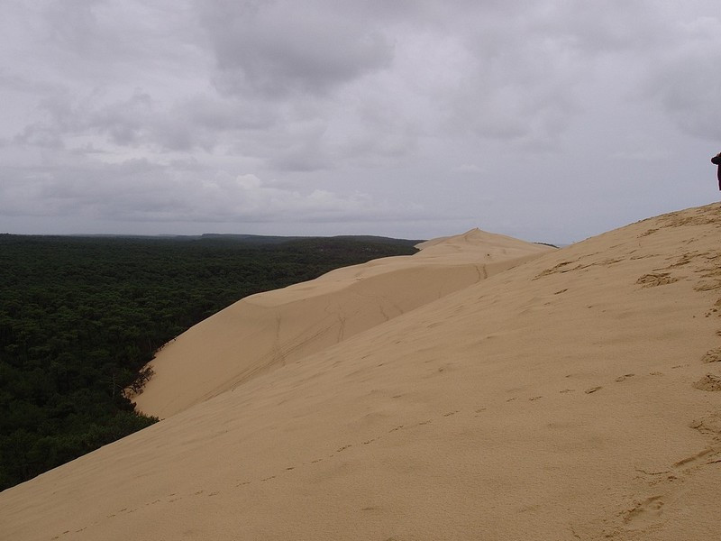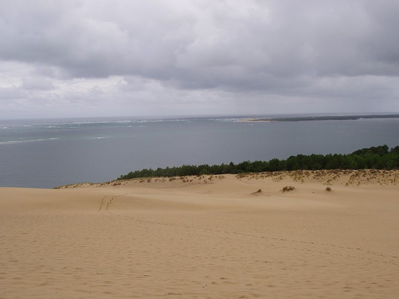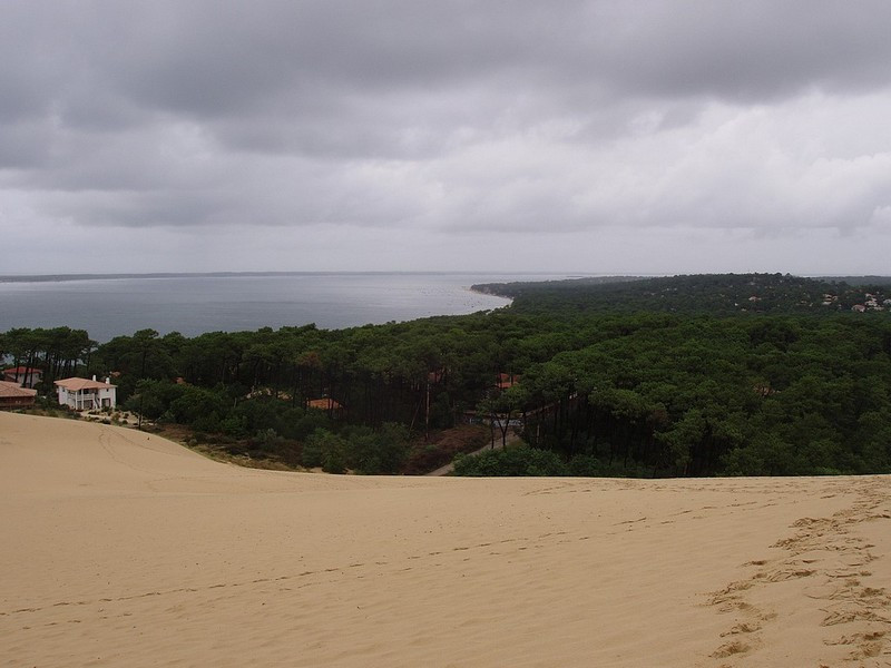La pluie se fait oublier pour l’instant ; les escaliers sont là dont nous gravissons les quelque cent cinquante marches. Encore quelques mètres sur le sable et nous sommes au sommet. À cent quatorze mètres d’altitude, le panorama est magnifique qui permet de contempler le bassin d’Arcachon, les passes du Bassin, le banc d’Arguin, le cap Ferret.