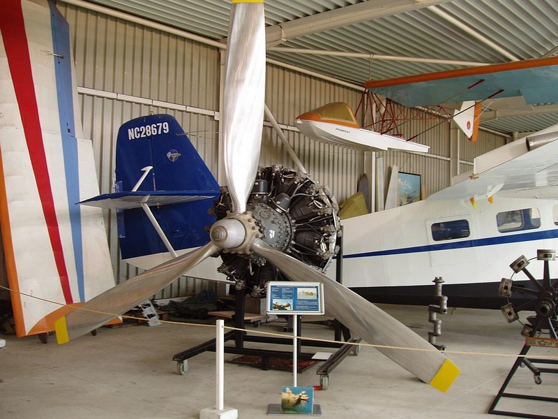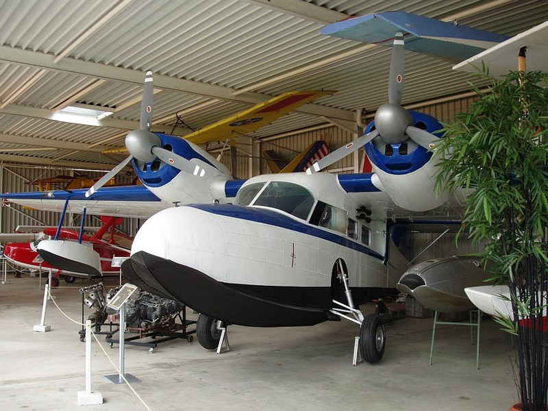 Dans un vaste hall où est exposé un Widgeon de la dernière guerre ainsi que d’autres appareils.