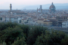 J’avais donc jeté mon dévolu sur le camping de Fiesole, à quelques kilomètres au nord de Florence, perché sur une colline d’où l’on jouit d’un panorama extraordinaire sur la ville, encore magnifié par la lumière du soir ; il est très calme, à l’écart de la petite ville très touristique, et très agréable. Mais il est difficile d’accès car les rues et le chemin à parcourir pour y accéder sont vraiment très étroits, or la circulation y est à double sens, et, pour couronner le tout, en très forte pente (14 et même 16 %) ! Montée d’adrénaline assurée !